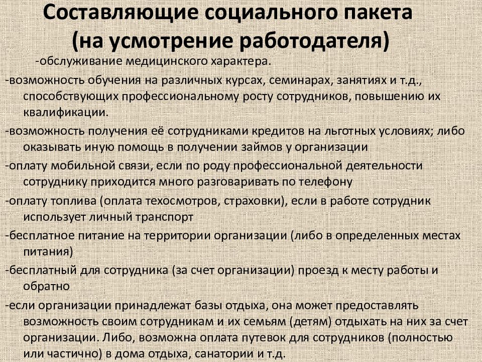 Слайд 17: Составляющие социального пакета (на усмотрение работодателя)