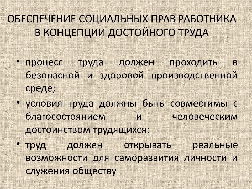 процесс труда должен проходить в безопасной и здоровой производственной среде; условия труда должны быть совместимы с благосостоянием и человеческим достоинством трудящихся; труд должен открывать реальные возможности для саморазвития личности и служения обществу