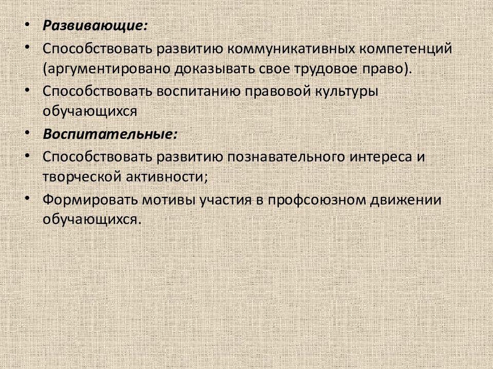 Развивающие: Способствовать развитию коммуникативных компетенций (аргументировано доказывать свое трудовое право). Способствовать воспитанию правовой культуры обучающихся Воспитательные: Способствовать развитию познавательного интереса и творческой активности; Формировать мотивы участия в профсоюзном движении обучающихся.