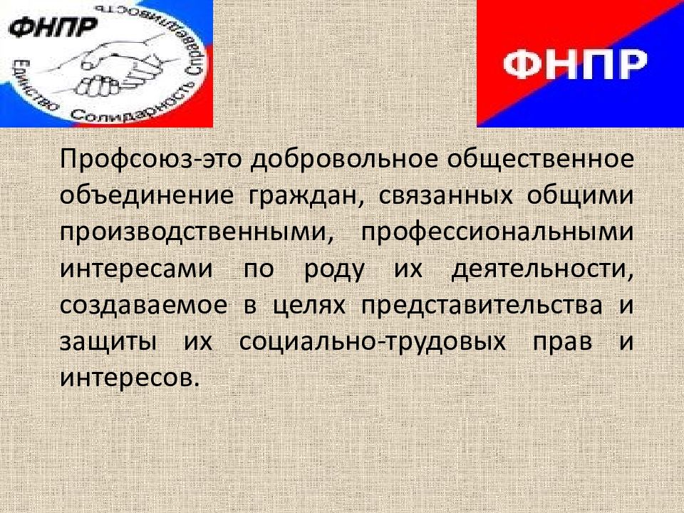 Профсоюз-это добровольное общественное объединение граждан, связанных общими производственными, профессиональными интересами по роду их деятельности, создаваемое в целях представительства и защиты их социально-трудовых прав и интересов.