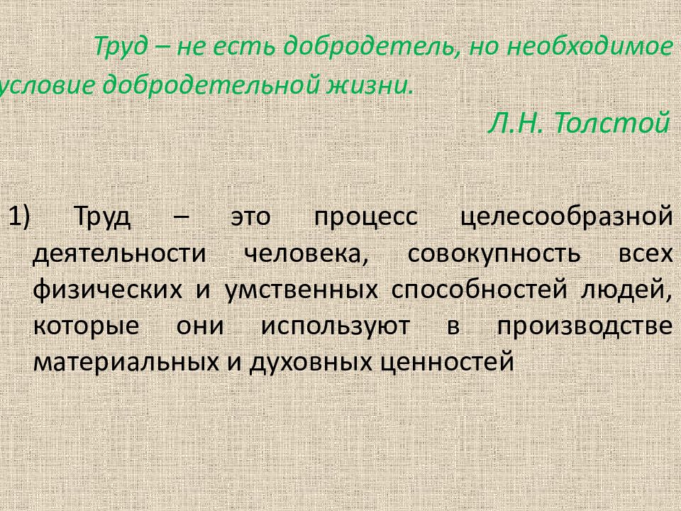 1) Труд – это процесс целесообразной деятельности человека, совокупность всех физических и умственных способностей людей, которые они используют в производстве материальных и духовных ценностей