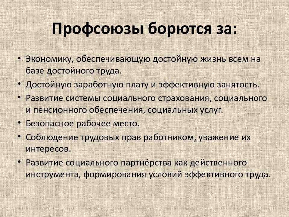 Экономику, обеспечивающую достойную жизнь всем на базе достойного труда. Достойную заработную плату и эффективную занятость. Развитие системы социального страхования, социального и пенсионного обеспечения, социальных услуг. Безопасное рабочее место. Соблюдение трудовых прав работником, уважение их интересов. Развитие социального партнёрства как действенного инструмента, формирования условий эффективного труда.