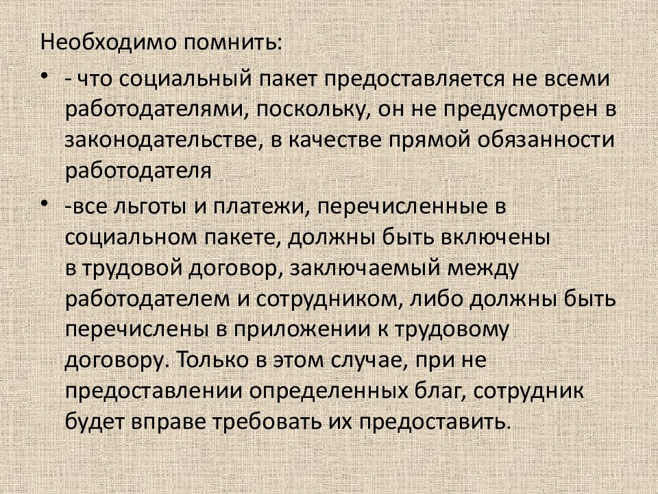 Необходимо помнить: - что социальный пакет предоставляется не всеми работодателями, поскольку, он не предусмотрен в законодательстве, в качестве прямой обязанности работодателя -все льготы и платежи, перечисленные в социальном пакете, должны быть включены в трудовой договор, заключаемый между работодателем и сотрудником, либо должны быть перечислены в приложении к трудовому договору. Только в этом случае, при не предоставлении определенных благ, сотрудник будет вправе требовать их предоставить.