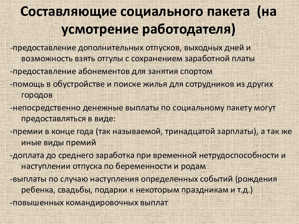 -предоставление дополнительных отпусков, выходных дней и возможность взять отгулы с сохранением заработной платы -предоставление абонементов для занятия спортом -помощь в обустройстве и поиске жилья для сотрудников из других городов -непосредственно денежные выплаты по социальному пакету могут предоставляться в виде: -премии в конце года (так называемой, тринадцатой зарплаты), а так же иные виды премий -доплата до среднего заработка при временной нетрудоспособности и наступлении отпуска по беременности и родам -выплаты по случаю наступления определенных событий (рождения ребенка, свадьбы, подарки к некоторым праздникам и т.д.) -повышенных командировочных выплат