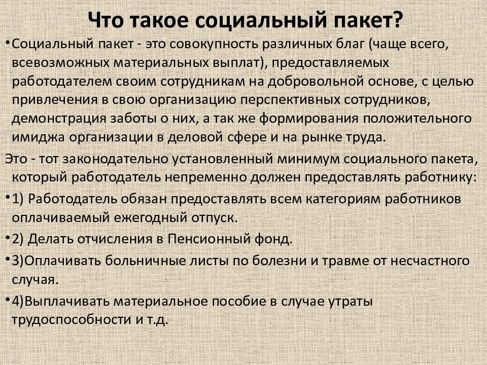 Социальный пакет - это совокупность различных благ (чаще всего, всевозможных материальных выплат), предоставляемых работодателем своим сотрудникам на добровольной основе, с целью привлечения в свою организацию перспективных сотрудников, демонстрация заботы о них, а так же формирования положительного имиджа организации в деловой сфере и на рынке труда. Это - тот законодательно установленный минимум социального пакета, который работодатель непременно должен предоставлять работнику: 1) Работодатель обязан предоставлять всем категориям работников оплачиваемый ежегодный отпуск. 2) Делать отчисления в Пенсионный фонд. 3)Оплачивать больничные листы по болезни и травме от несчастного случая. 4)Выплачивать материальное пособие в случае утраты трудоспособности и т.д.