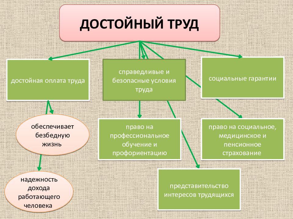 достойная оплата труда социальные гарантии право на социальное, медицинское и пенсионное страхование справедливые и безопасные условия труда право на профессиональное обучение и профориентацию обеспечивает безбедную жизнь надежность дохода работающего человека представительство интересов трудящихся ДОСТОЙНЫЙ ТРУД
