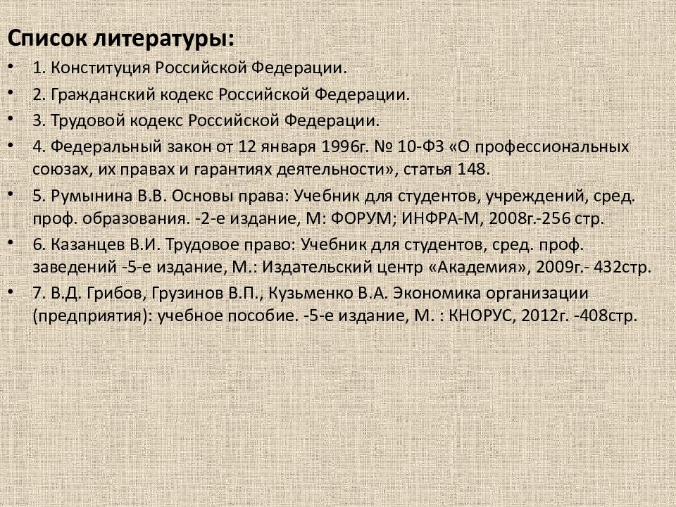 Список литературы: 1. Конституция Российской Федерации. 2. Гражданский кодекс Российской Федерации. 3. Трудовой кодекс Российской Федерации. 4. Федеральный закон от 12 января 1996г. № 10-ФЗ «О профессиональных союзах, их правах и гарантиях деятельности», статья 148. 5. Румынина В.В. Основы права: Учебник для студентов, учреждений, сред. проф. образования. -2-е издание, М: ФОРУМ; ИНФРА-М, 2008г.-256 стр. 6. Казанцев В.И. Трудовое право: Учебник для студентов, сред. проф. заведений -5-е издание, М.: Издательский центр «Академия», 2009г.- 432стр. 7. В.Д. Грибов, Грузинов В.П., Кузьменко В.А. Экономика организации (предприятия): учебное пособие. -5-е издание, М. : КНОРУС, 2012г. -408стр.