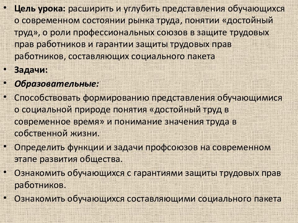 Цель урока: расширить и углубить представления обучающихся о современном состоянии рынка труда, понятии «достойный труд», о роли профессиональных союзов в защите трудовых прав работников и гарантии защиты трудовых прав работников, составляющих социального пакета Задачи: Образовательные: Способствовать формированию представления обучающимися о социальной природе понятия «достойный труд в современное время» и понимание значения труда в собственной жизни. Определить функции и задачи профсоюзов на современном этапе развития общества. Ознакомить обучающихся с гарантиями защиты трудовых прав работников. Ознакомить обучающихся составляющими социального пакета