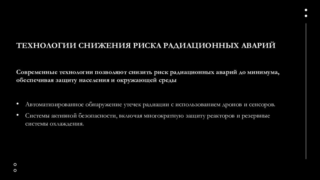 Автоматизированное обнаружение утечек радиации с использованием дронов и сенсоров. Системы активной безопасности, включая многократную защиту реакторов и резервные системы охлаждения. Современные технологии позволяют снизить риск радиационных аварий до минимума, обеспечивая защиту населения и окружающей среды