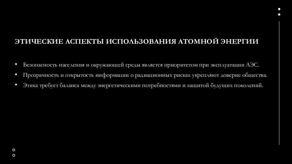 Безопасность населения и окружающей среды является приоритетом при эксплуатации АЭС. Прозрачность и открытость информации о радиационных рисках укрепляют доверие общества. Этика требует баланса между энергетическими потребностями и защитой будущих поколений.
