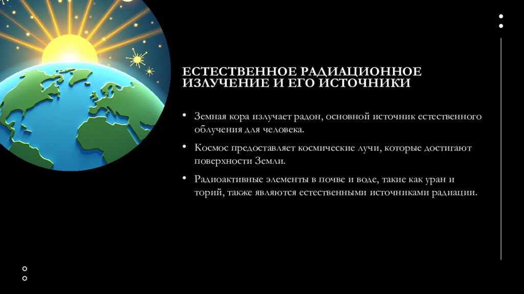Земная кора излучает радон, основной источник естественного облучения для человека. Космос предоставляет космические лучи, которые достигают поверхности Земли. Радиоактивные элементы в почве и воде, такие как уран и торий, также являются естественными источниками радиации.