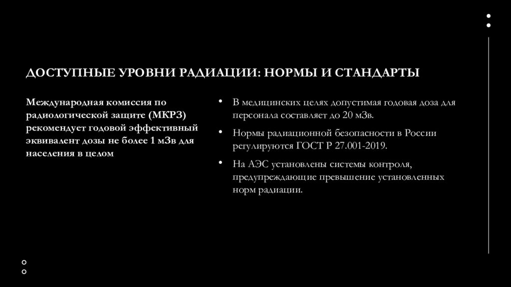 В медицинских целях допустимая годовая доза для персонала составляет до 20 мЗв. Нормы радиационной безопасности в России регулируются ГОСТ Р 27.001-2019. На АЭС установлены системы контроля, предупреждающие превышение установленных норм радиации. Международная комиссия по радиологической защите (МКРЗ) рекомендует годовой эффективный эквивалент дозы не более 1 мЗв для населения в целом