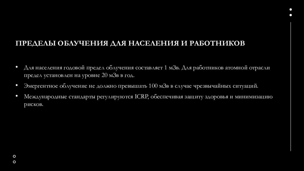 Для населения годовой предел облучения составляет 1 мЗв. Для работников атомной отрасли предел установлен на уровне 20 мЗв в год. Эмергентное облучение не должно превышать 100 мЗв в случае чрезвычайных ситуаций. Международные стандарты регулируются ICRP, обеспечивая защиту здоровья и минимизацию рисков.