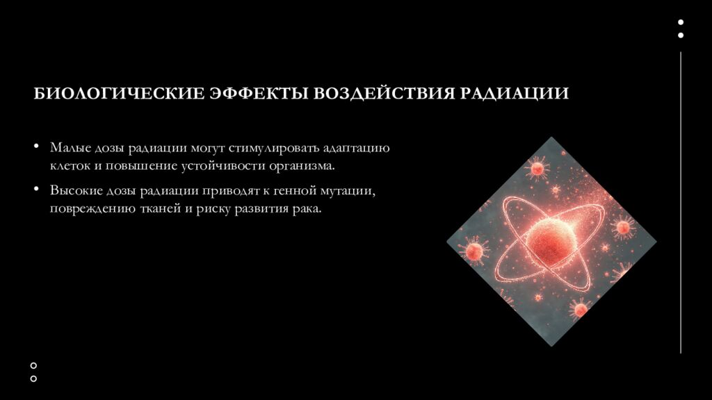 Малые дозы радиации могут стимулировать адаптацию клеток и повышение устойчивости организма. Высокие дозы радиации приводят к генной мутации, повреждению тканей и риску развития рака.