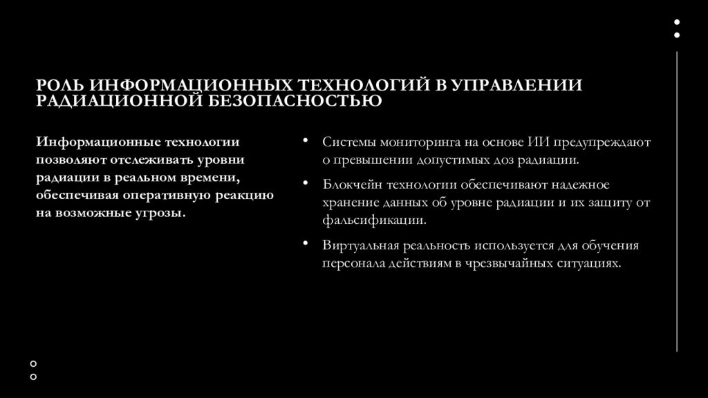 Системы мониторинга на основе ИИ предупреждают о превышении допустимых доз радиации. Блокчейн технологии обеспечивают надежное хранение данных об уровне радиации и их защиту от фальсификации. Виртуальная реальность используется для обучения персонала действиям в чрезвычайных ситуациях. Информационные технологии позволяют отслеживать уровни радиации в реальном времени, обеспечивая оперативную реакцию на возможные угрозы.