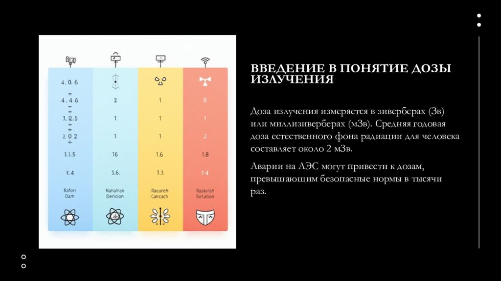 Доза излучения измеряется в зиверберах (Зв) или миллизиверберах (мЗв). Средняя годовая доза естественного фона радиации для человека составляет около 2 мЗв. Аварии на АЭС могут привести к дозам, превышающим безопасные нормы в тысячи раз.