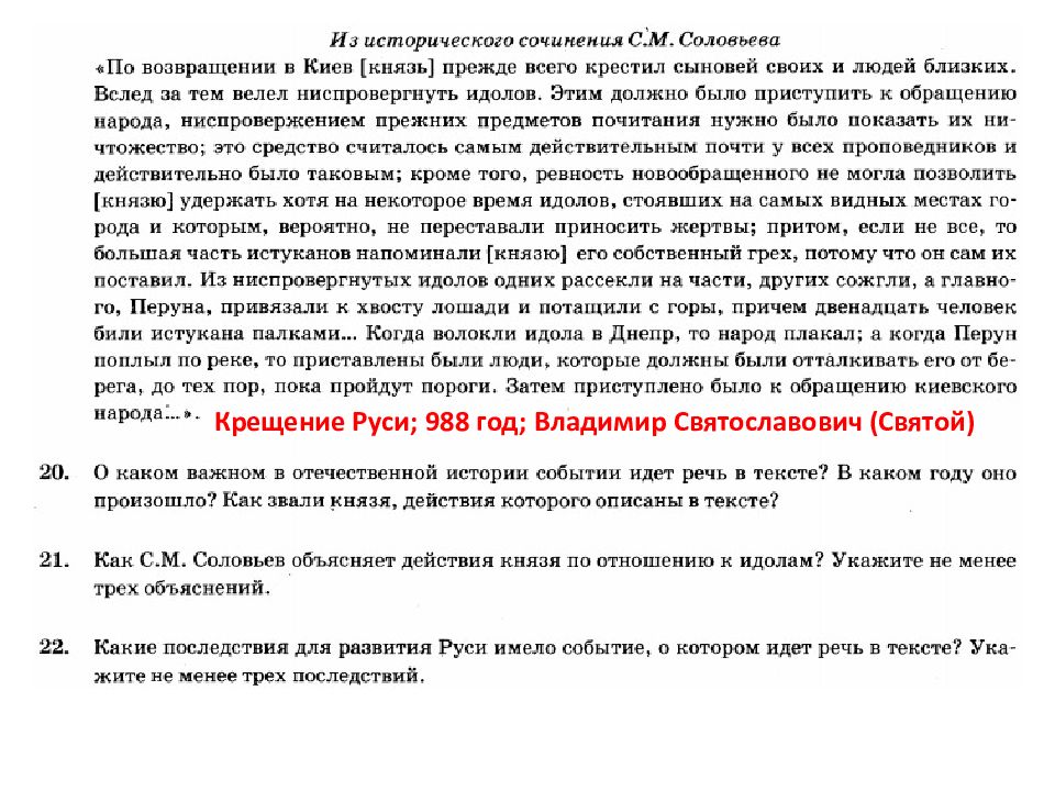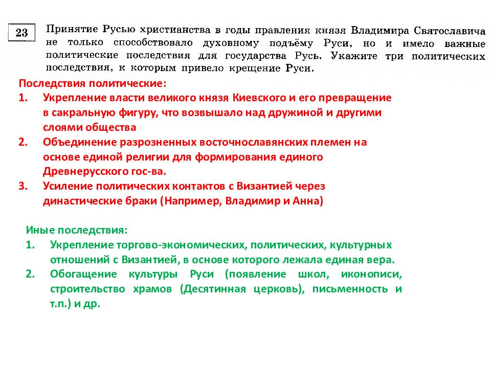 Последствия политические: Укрепление власти великого князя Киевского и его превращение в сакральную фигуру, что возвышало над дружиной и другими слоями общества Объединение разрозненных восточнославянских племен на основе единой религии для формирования единого Древнерусского гос-ва. Усиление политических контактов с Византией через династические браки (Например, Владимир и Анна) Иные последствия: Укрепление торгово-экономических, политических, культурных отношений с Византией, в основе которого лежала единая вера. Обогащение культуры Руси (появление школ, иконописи, строительство храмов (Десятинная церковь), письменность и т.п.) и др.