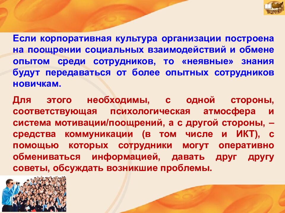 Если корпоративная культура организации построена на поощрении социальных взаимодействий и обмене опытом среди сотрудников, то «неявные» знания будут передаваться от более опытных сотрудников новичкам. Для этого необходимы, с одной стороны, соответствующая психологическая атмосфера и система мотивации/поощрений, а с другой стороны, – средства коммуникации (в том числе и ИКТ), с помощью которых сотрудники могут оперативно обмениваться информацией, давать друг другу советы, обсуждать возникшие проблемы.