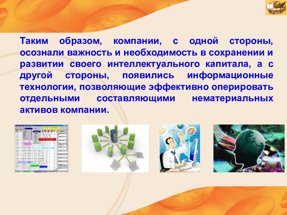 Таким образом, компании, с одной стороны, осознали важность и необходимость в сохранении и развитии своего интеллектуального капитала, а с другой стороны, появились информационные технологии, позволяющие эффективно оперировать отдельными составляющими нематериальных активов компании.