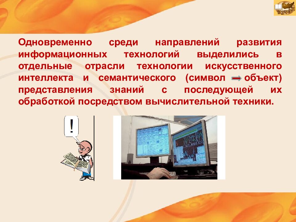 Одновременно среди направлений развития информационных технологий выделились в отдельные отрасли технологии искусственного интеллекта и семантического (символ объект) представления знаний с последующей их обработкой посредством вычислительной техники.