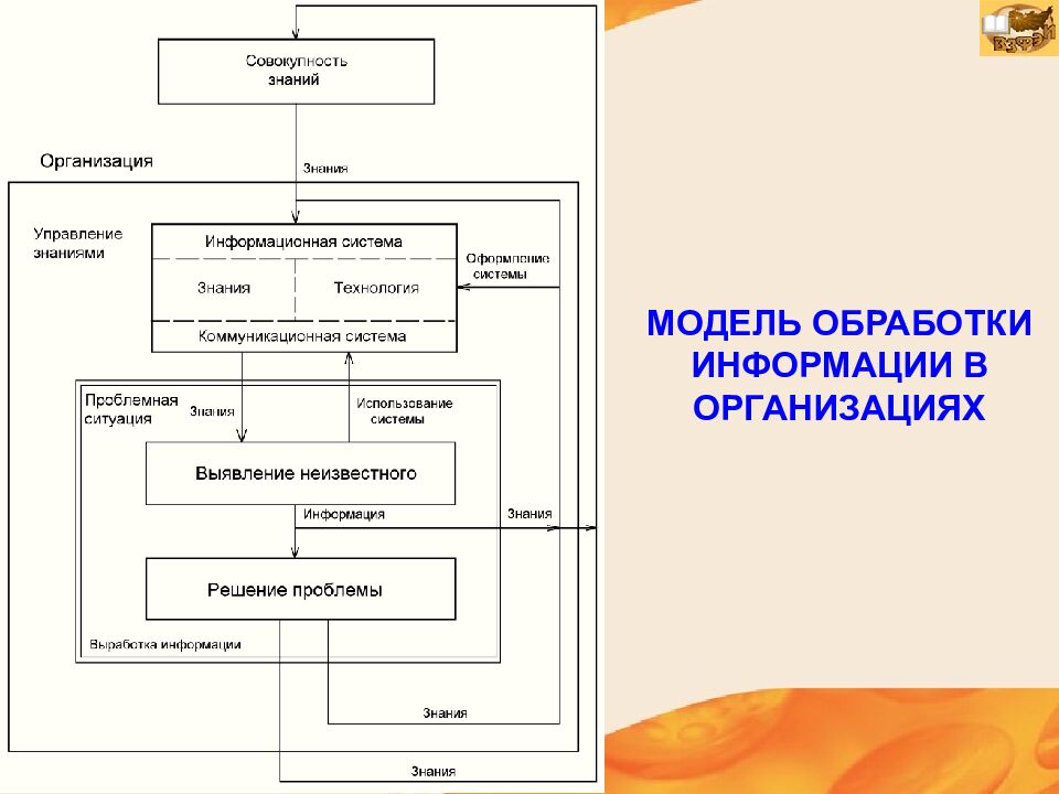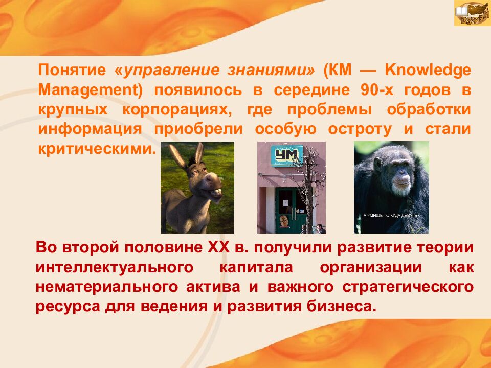 Во второй половине ХХ в. получили развитие теории интеллектуального капитала организации как нематериального актива и важного стратегического ресурса для ведения и развития бизнеса. Понятие « управление знаниями» (КМ — Knowledge Management ) появилось в середине 90-х годов в крупных корпорациях, где проблемы обработки информация приобрели особую остроту и стали критическими.