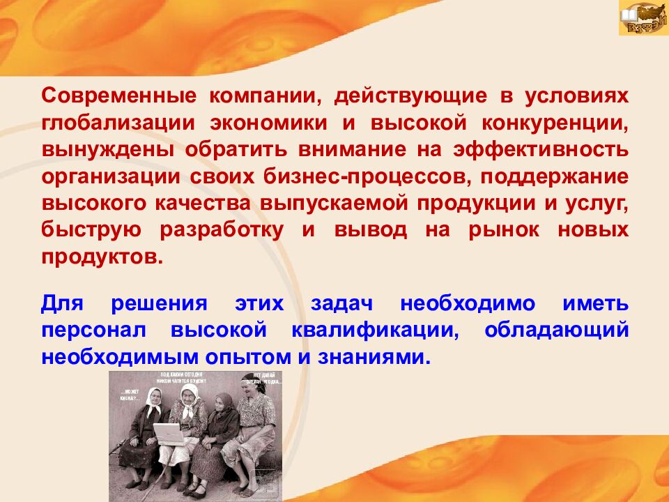 Современные компании, действующие в условиях глобализации экономики и высокой конкуренции, вынуждены обратить внимание на эффективность организации своих бизнес-процессов, поддержание высокого качества выпускаемой продукции и услуг, быструю разработку и вывод на рынок новых продуктов. Для решения этих задач необходимо иметь персонал высокой квалификации, обладающий необходимым опытом и знаниями.