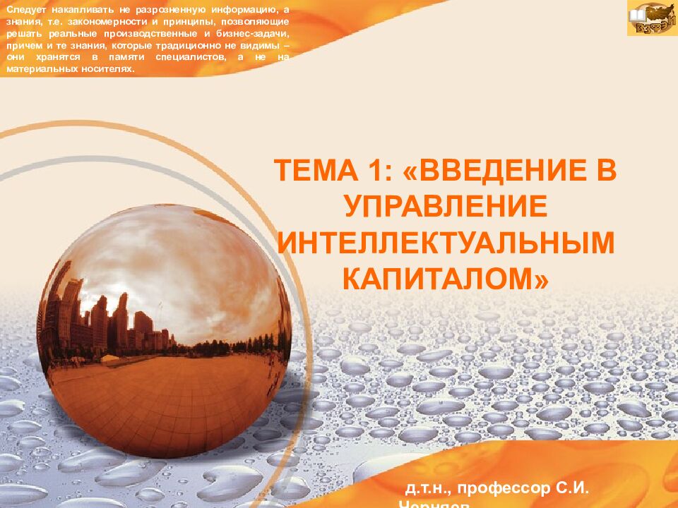 д.т.н., профессор С.И. Черняев ТЕМА 1: «ВВЕДЕНИЕ В УПРАВЛЕНИЕ ИНТЕЛЛЕКТУАЛЬНЫМ КАПИТАЛОМ» Следует накапливать не разрозненную информацию, а знания, т.е. закономерности и принципы, позволяющие решать реальные производственные и бизнес-задачи, причем и те знания, которые традиционно не видимы – они хранятся в памяти специалистов, а не на материальных носителях.