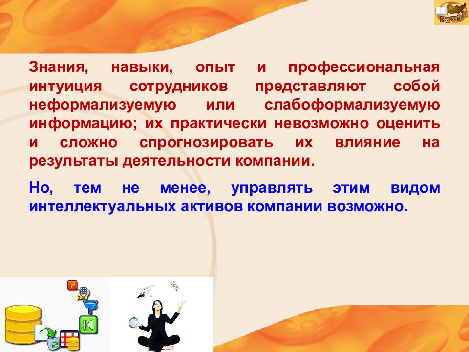 Знания, навыки, опыт и профессиональная интуиция сотрудников представляют собой неформализуемую или слабоформализуемую информацию; их практически невозможно оценить и сложно спрогнозировать их влияние на результаты деятельности компании. Но, тем не менее, управлять этим видом интеллектуальных активов компании возможно.