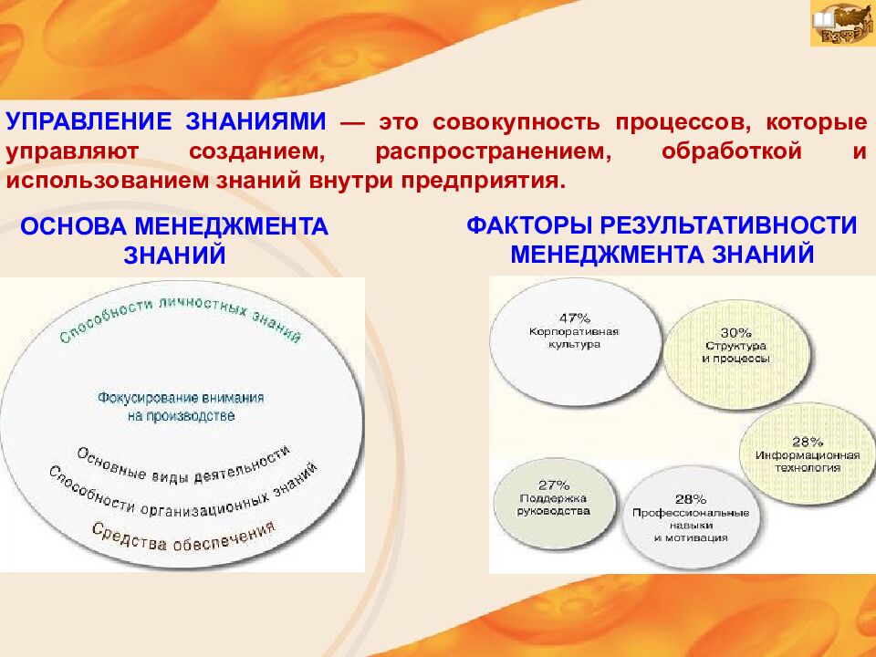 ФАКТОРЫ РЕЗУЛЬТАТИВНОСТИ МЕНЕДЖМЕНТА ЗНАНИЙ УПРАВЛЕНИЕ ЗНАНИЯМИ — это совокупность процессов, которые управляют созданием, распространением, обработкой и использованием знаний внутри предприятия.