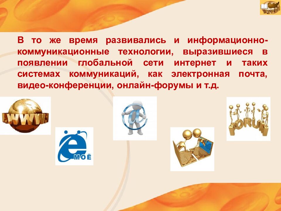 В то же время развивались и информационно-коммуникационные технологии, выразившиеся в появлении глобальной сети интернет и таких системах коммуникаций, как электронная почта, видео-конференции, онлайн-форумы и т.д.