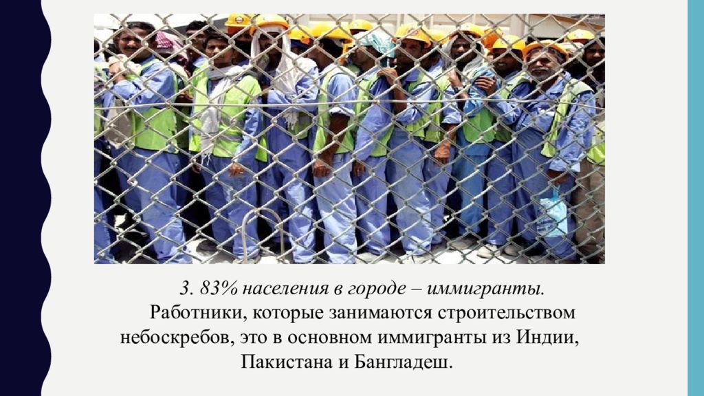 3. 83% населения в городе – иммигранты. Работники, которые занимаются строительством небоскребов, это в основном иммигранты из Индии, Пакистана и Бангладеш.