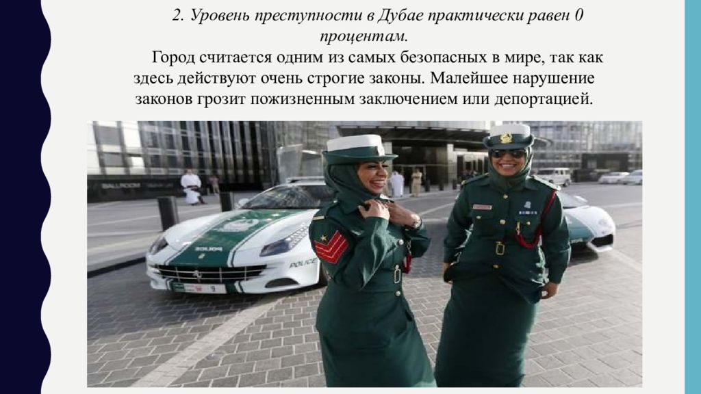2. Уровень преступности в Дубае практически равен 0 процентам. Город считается одним из самых безопасных в мире, так как здесь действуют очень строгие законы. Малейшее нарушение законов грозит пожизненным заключением или депортацией.