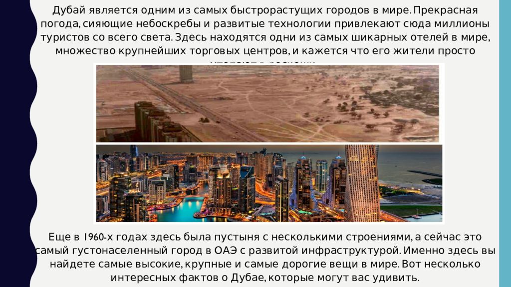 Дубай является одним из самых быстрорастущих городов в мире. Прекрасная погода, сияющие небоскребы и развитые технологии привлекают сюда миллионы туристов со всего света. Здесь находятся одни из самых шикарных отелей в мире, множество крупнейших торговых центров, и кажется что его жители просто утопают в роскоши. Еще в 1960-х годах здесь была пустыня с несколькими строениями, а сейчас это самый густонаселенный город в ОАЭ с развитой инфраструктурой. Именно здесь вы найдете самые высокие, крупные и самые дорогие вещи в мире. Вот несколько интересных фактов о Дубае, которые могут вас удивить.