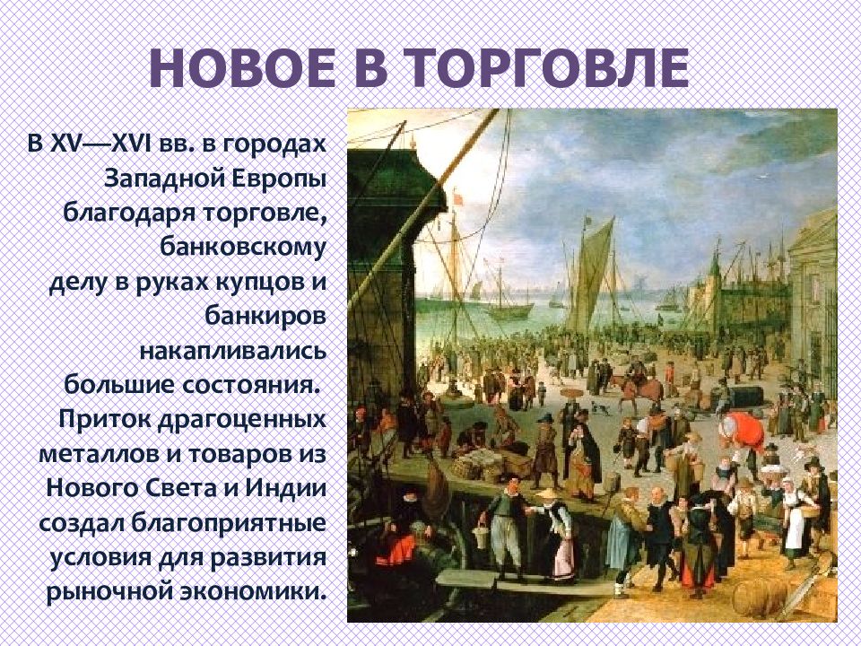 В XV—XVI вв. в городах Западной Европы благодаря торговле, банковскому делу в руках купцов и банкиров накапливались большие состояния. Приток драгоценных металлов и товаров из Нового Света и Индии создал благоприятные условия для развития рыночной экономики.