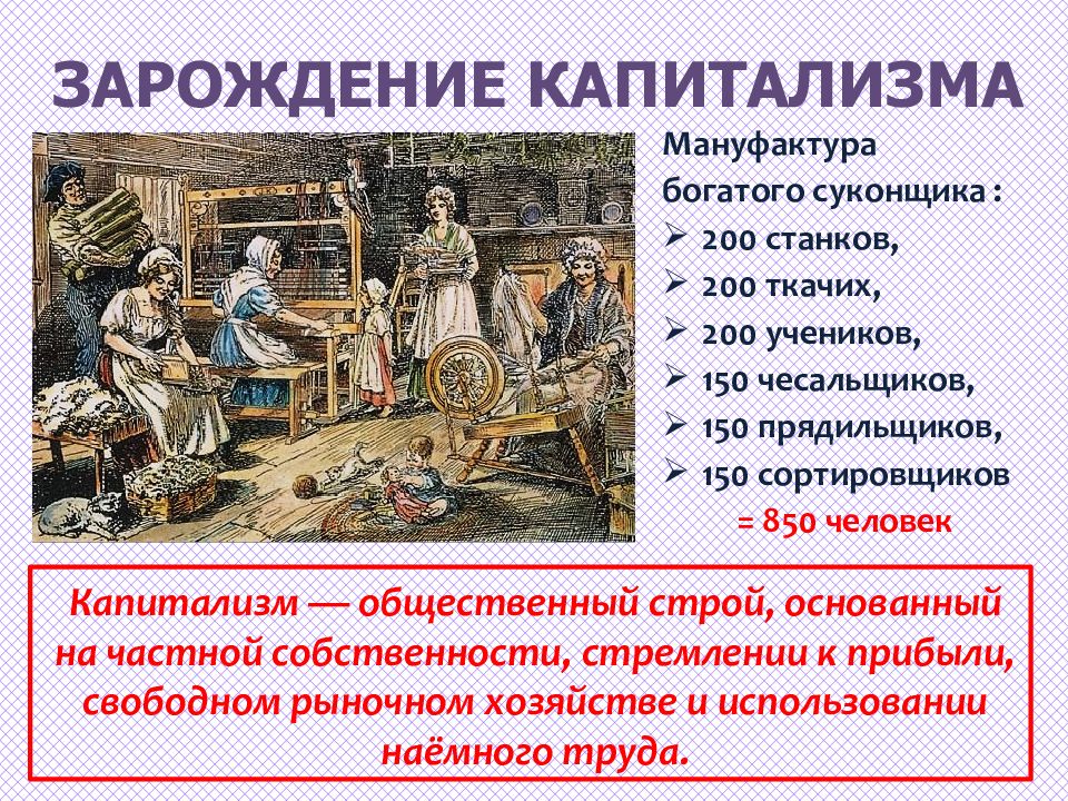 Мануфактура богатого суконщика : 200 станков, 200 ткачих, 200 учеников, 150 чесальщиков, 150 прядильщиков, 150 сортировщиков = 850 человек К апитализм — общественный строй, основанный на частной собственности, стремлении к прибыли, свободном рыночном хозяйстве и использовании наёмного труда.