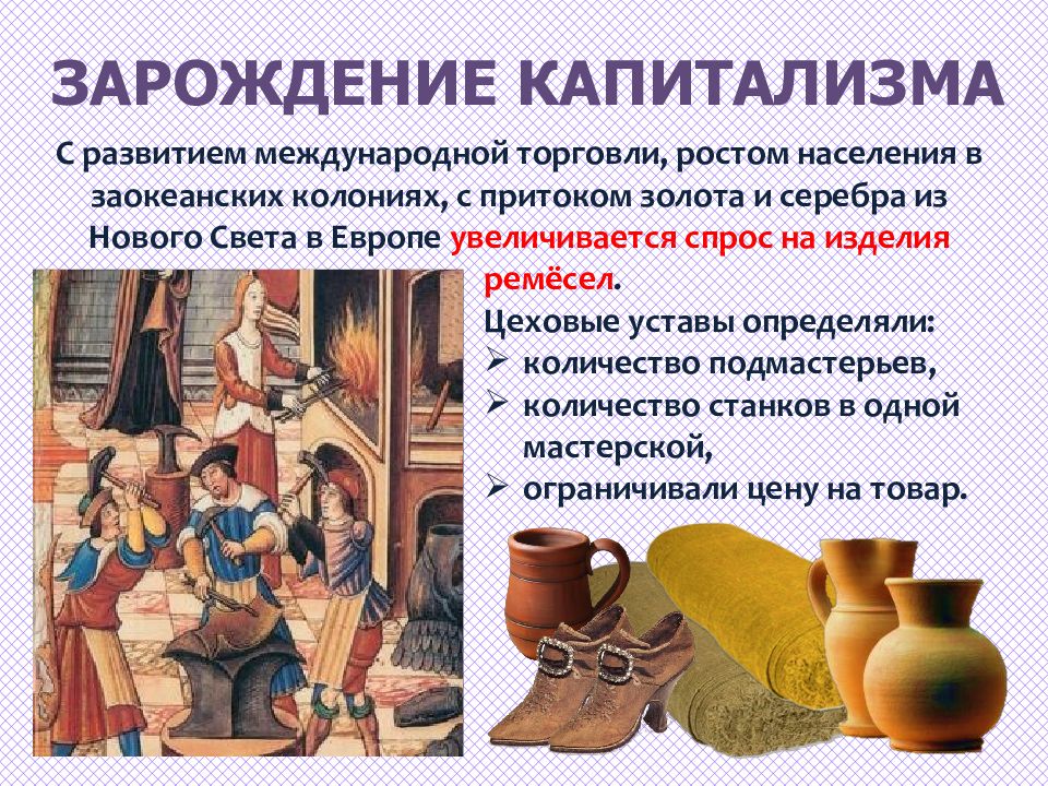С развитием международной торговли, ростом населения в заокеанских колониях, с притоком золота и серебра из Нового Света в Европе увеличивается спрос на изделия ремёсел. Цеховые уставы определяли: количество подмастерьев, количество станков в одной мастерской, ограничивали цену на товар.