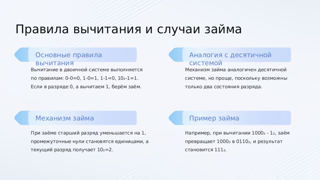 Основные правила вычитания Вычитание в двоичной системе выполняется по правилам: 0-0=0, 1-0=1, 1-1=0, 10₂-1=1. Если в разряде 0, а вычитаем 1, берём заём. Механизм займа При заёме старший разряд уменьшается на 1, промежуточные нули становятся единицами, а текущий разряд получает 10₂=2. Аналогия с десятичной системой Механизм займа аналогичен десятичной системе, но проще, поскольку возможны только два состояния разряда. Пример займа Например, при вычитании 1000₂ - 1₂, заём превращает 1000₂ в 0110₂, и результат становится 111₂. Правила вычитания и случаи займа