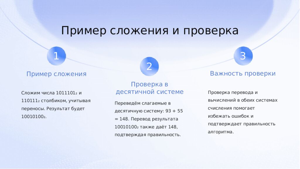 1 2 3 Пример сложения и проверка Сложим числа 1011101₂ и 110111₂ столбиком, учитывая переносы. Результат будет 10010100₂. Пример сложения Переведём слагаемые в десятичную систему: 93 + 55 = 148. Перевод результата 10010100₂ также даёт 148, подтверждая правильность. Проверка в десятичной системе Проверка перевода и вычислений в обеих системах счисления помогает избежать ошибок и подтверждает правильность алгоритма. Важность проверки