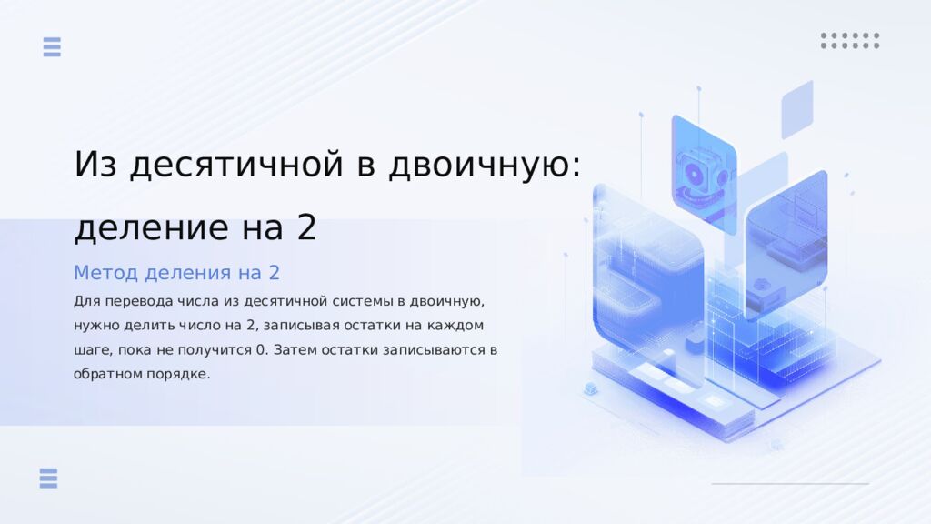 Из десятичной в двоичную: деление на 2 Метод деления на 2 Для перевода числа из десятичной системы в двоичную, нужно делить число на 2, записывая остатки на каждом шаге, пока не получится 0. Затем остатки записываются в обратном порядке.