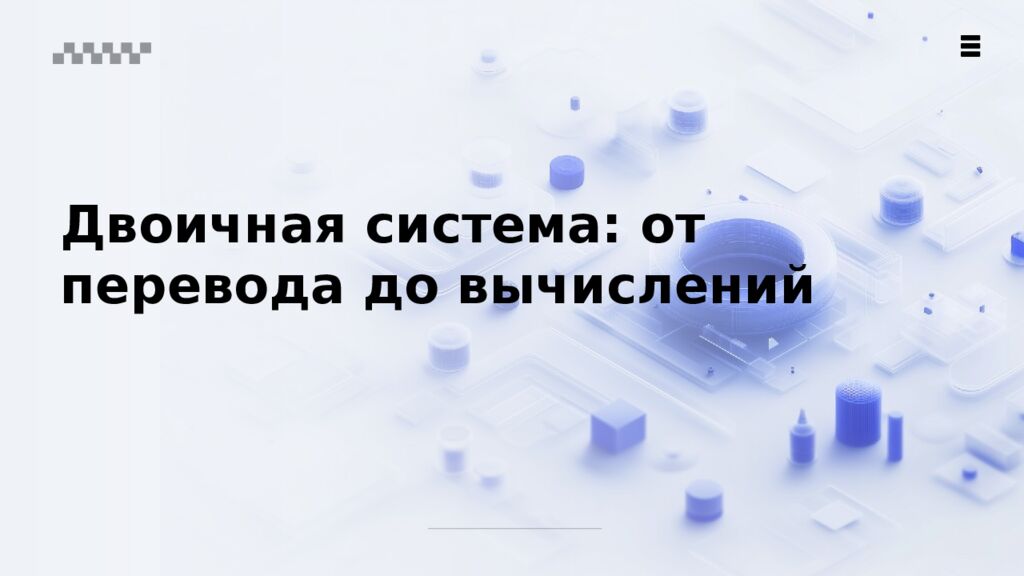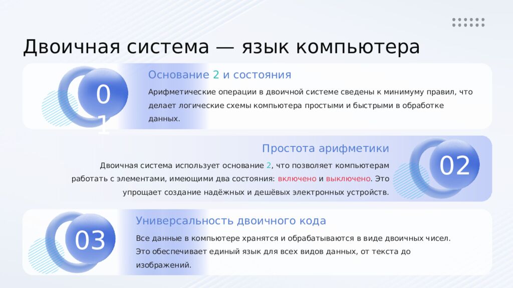 Двоичная система — язык компьютера Арифметические операции в двоичной системе сведены к минимуму правил, что делает логические схемы компьютера простыми и быстрыми в обработке данных. Основание 2 и состояния Двоичная система использует основание 2, что позволяет компьютерам работать с элементами, имеющими два состояния: включено и выключено. Это упрощает создание надёжных и дешёвых электронных устройств. Простота арифметики Все данные в компьютере хранятся и обрабатываются в виде двоичных чисел. Это обеспечивает единый язык для всех видов данных, от текста до изображений. Универсальность двоичного кода 01 03 02