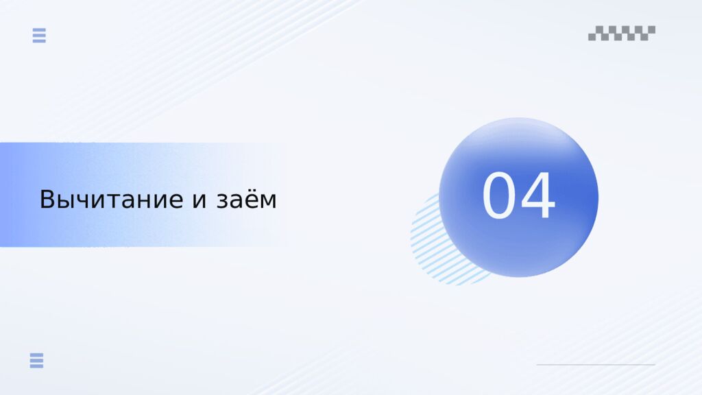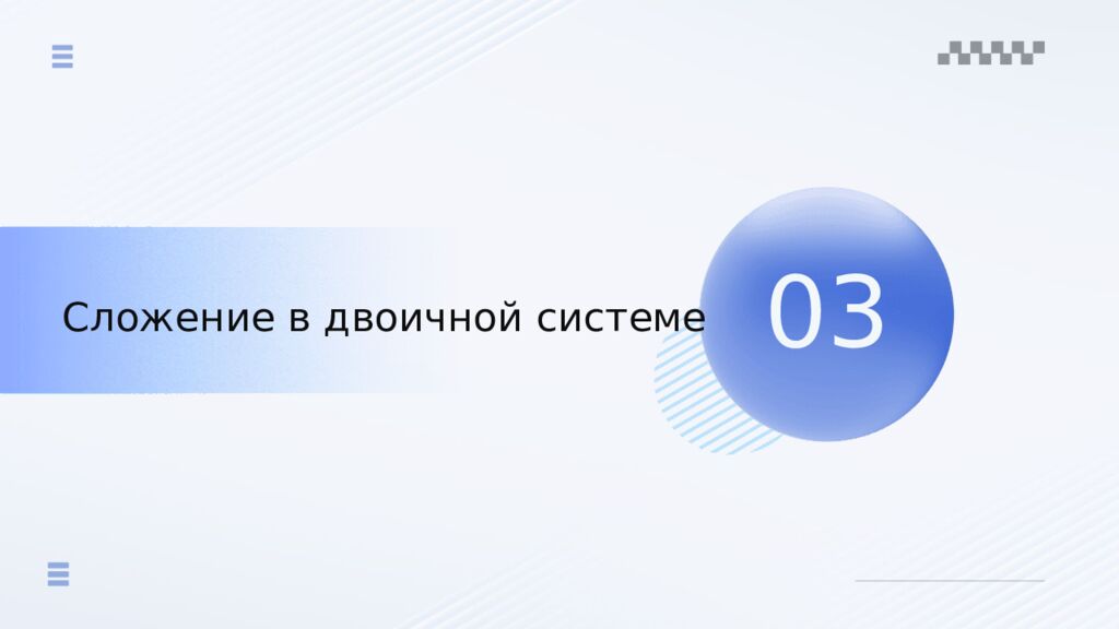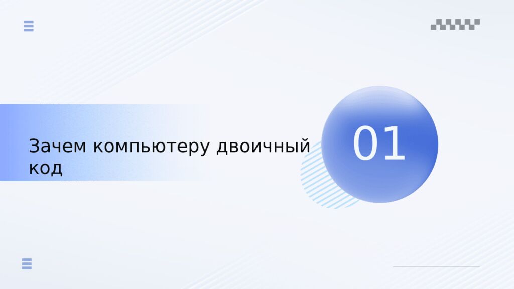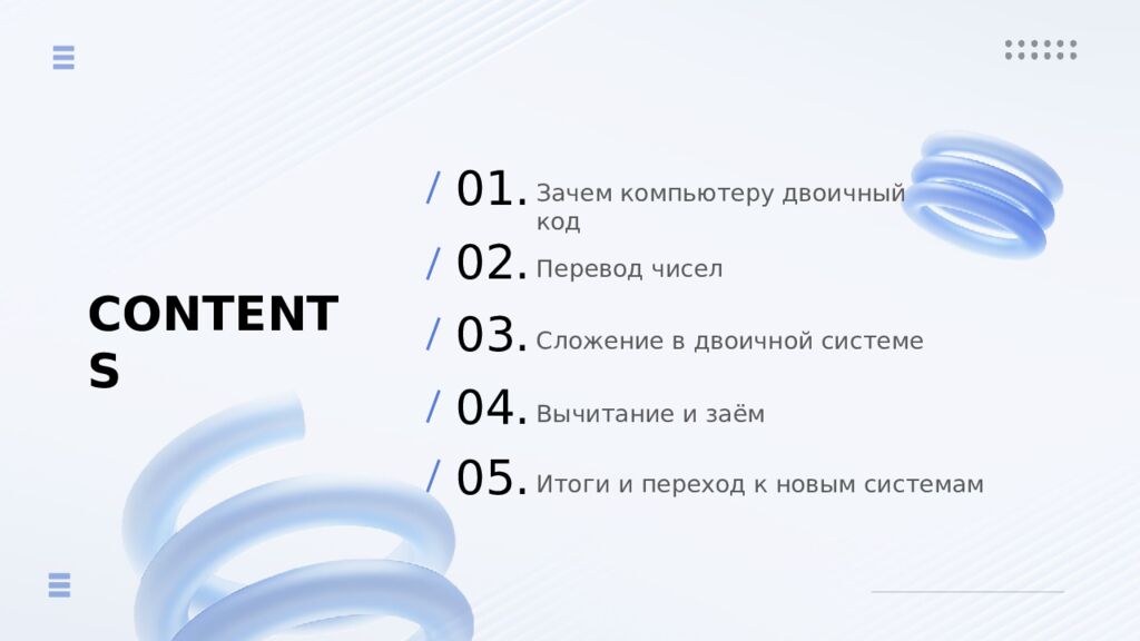 02. Перевод чисел 03. Сложение в двоичной системе 04. Вычитание и заём 05. Итоги и переход к новым системам 01. Зачем компьютеру двоичный код CONTENTS