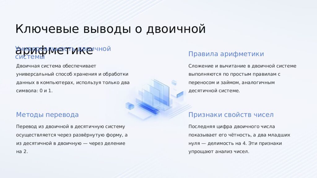 Ключевые выводы о двоичной арифметике Правила арифметики Сложение и вычитание в двоичной системе выполняются по простым правилам с переносом и займом, аналогичным десятичной системе. Признаки свойств чисел Последняя цифра двоичного числа показывает его чётность, а два младших нуля — делимость на 4. Эти признаки упрощают анализ чисел. Универсальность двоичной системы Двоичная система обеспечивает универсальный способ хранения и обработки данных в компьютерах, используя только два символа: 0 и 1. Методы перевода Перевод из двоичной в десятичную систему осуществляется через развёрнутую форму, а из десятичной в двоичную — через деление на 2.