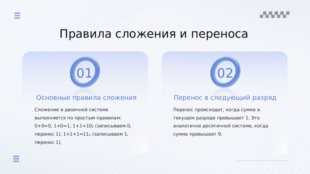 Правила сложения и переноса Основные правила сложения Сложение в двоичной системе выполняется по простым правилам: 0+0=0, 1+0=1, 1+1=10₂ (записываем 0, перенос 1), 1+1+1=11₂ (записываем 1, перенос 1). Перенос в следующий разряд Перенос происходит, когда сумма в текущем разряде превышает 1. Это аналогично десятичной системе, когда сумма превышает 9. 01 02