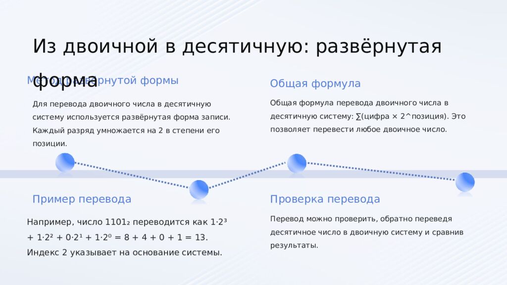 Метод развёрнутой формы Для перевода двоичного числа в десятичную систему используется развёрнутая форма записи. Каждый разряд умножается на 2 в степени его позиции. Пример перевода Например, число 1101₂ переводится как 1·2³ + 1·2² + 0·2¹ + 1·2⁰ = 8 + 4 + 0 + 1 = 13. Индекс 2 указывает на основание системы. Общая формула Общая формула перевода двоичного числа в десятичную систему: ∑(цифра × 2^позиция). Это позволяет перевести любое двоичное число. Проверка перевода Перевод можно проверить, обратно переведя десятичное число в двоичную систему и сравнив результаты. Из двоичной в десятичную: развёрнутая форма