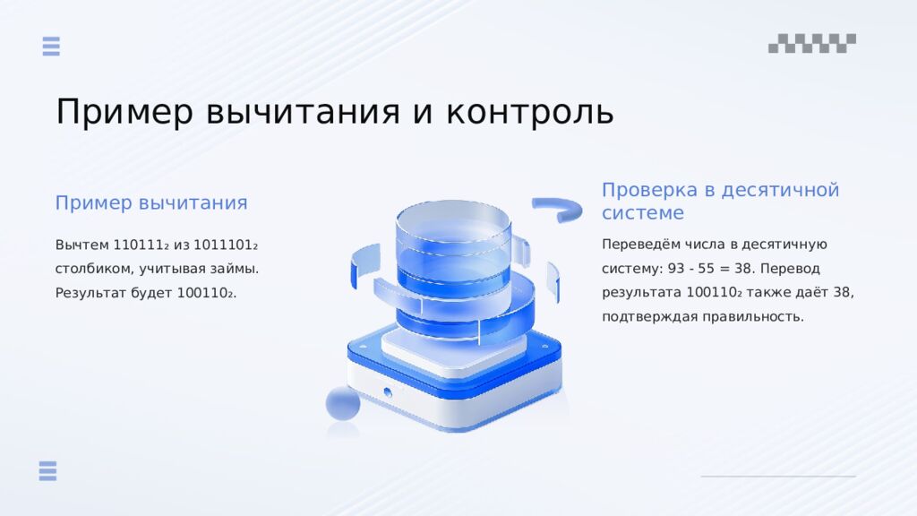 Пример вычитания и контроль Пример вычитания Вычтем 110111₂ из 1011101₂ столбиком, учитывая займы. Результат будет 100110₂. Проверка в десятичной системе Переведём числа в десятичную систему: 93 - 55 = 38. Перевод результата 100110₂ также даёт 38, подтверждая правильность.