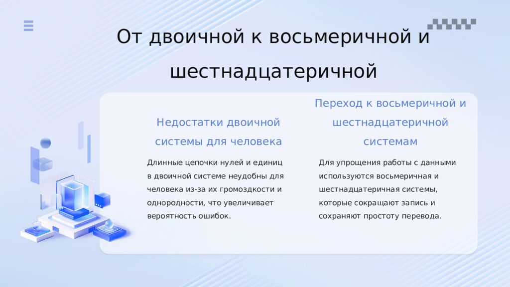 Длинные цепочки нулей и единиц в двоичной системе неудобны для человека из-за их громоздкости и однородности, что увеличивает вероятность ошибок. От двоичной к восьмеричной и шестнадцатеричной Недостатки двоичной системы для человека Для упрощения работы с данными используются восьмеричная и шестнадцатеричная системы, которые сокращают запись и сохраняют простоту перевода. Переход к восьмеричной и шестнадцатеричной системам