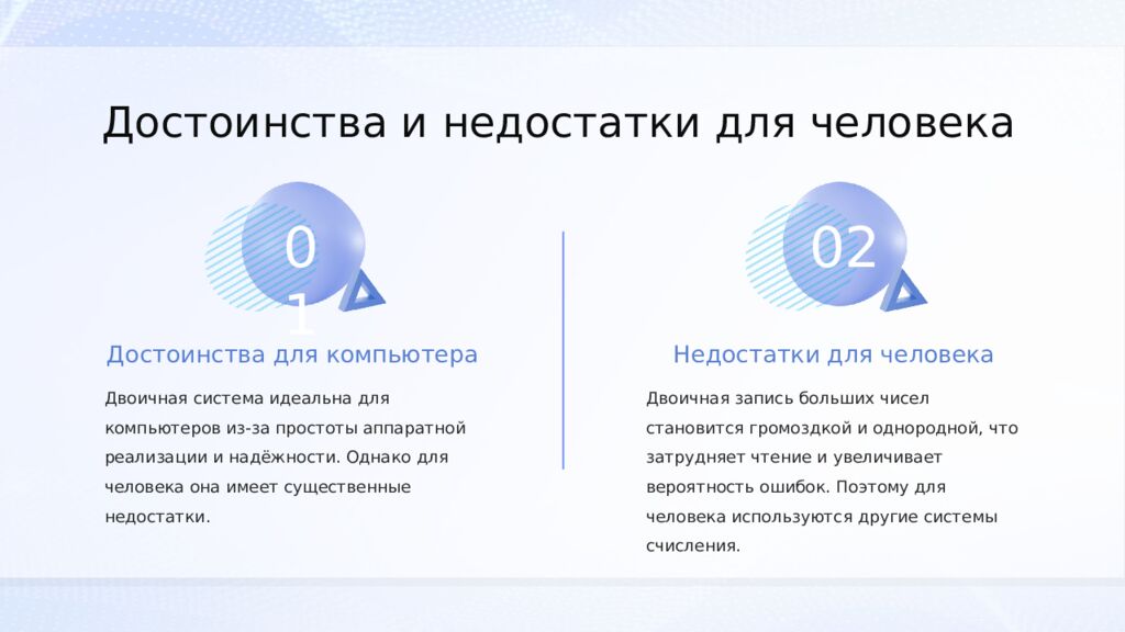 Достоинства и недостатки для человека Достоинства для компьютера Двоичная система идеальна для компьютеров из-за простоты аппаратной реализации и надёжности. Однако для человека она имеет существенные недостатки. Недостатки для человека Двоичная запись больших чисел становится громоздкой и однородной, что затрудняет чтение и увеличивает вероятность ошибок. Поэтому для человека используются другие системы счисления. 01 02