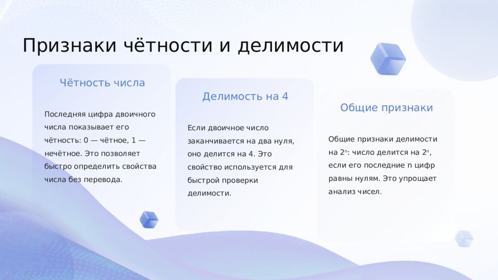 Признаки чётности и делимости Если двоичное число заканчивается на два нуля, оно делится на 4. Это свойство используется для быстрой проверки делимости. Делимость на 4 Общие признаки делимости на 2ⁿ: число делится на 2ⁿ, если его последние n цифр равны нулям. Это упрощает анализ чисел. Общие признаки Последняя цифра двоичного числа показывает его чётность: 0 — чётное, 1 — нечётное. Это позволяет быстро определить свойства числа без перевода. Чётность числа