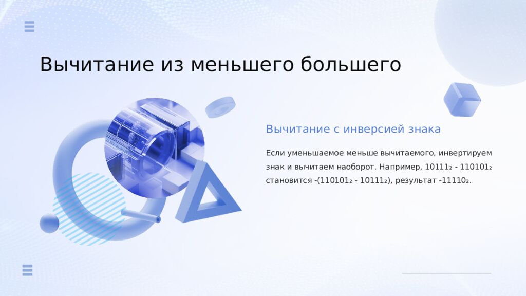 Если уменьшаемое меньше вычитаемого, инвертируем знак и вычитаем наоборот. Например, 10111₂ - 110101₂ становится -(110101₂ - 10111₂), результат -11110₂. Вычитание из меньшего большего Вычитание с инверсией знака