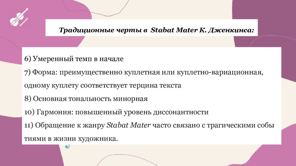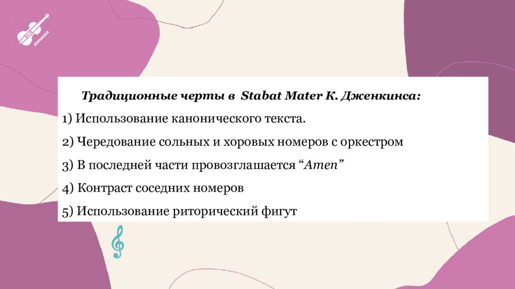 Традиционные черты в Stabat Mater К. Дженкинса: 1) Использование канонического текста. 2) Чередование сольных и хоровых номеров с оркестром 3) В последней части провозглашается “ Amen” 4) Контраст соседних номеров 5) Использование риторический фигут
